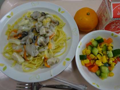 本日の献立 スパゲッティきのこソース 牛乳 トロピカルサラダ みかん