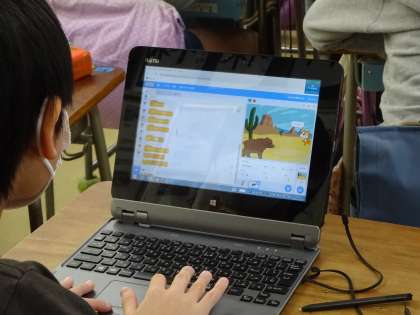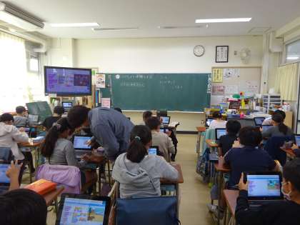 スクラッチをしました。タブレットの扱いにも十分慣れている4年生。それぞれが工夫して取り組みました。今後は4年生が2年生にも教えていきます。先日は1年生に教えた4年生、様々な取り組みで活躍しています。