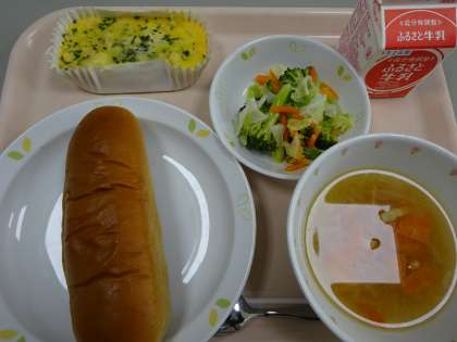 本日の献立 黒砂糖パン 牛乳 フレンチエッグ ブロッコリーのサラダ
