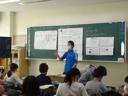 「拡大図と縮図」の学習をしています。今日は、拡大図と縮図の意味を理解したり、方眼を使って拡大図と縮図を作図したりしました。2学級3展開で学習をすすめています。