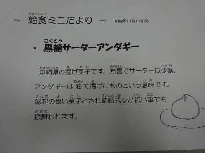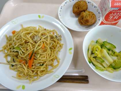 本日の献立 塩焼きそば 牛乳 野菜の中華かけ 黒糖サーターアンダギー