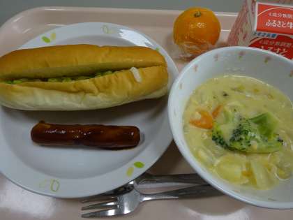 本日の献立 セルフウィンナーサンド 牛乳 クラムチャウダー みかん