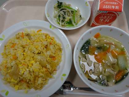 本日の献立 キムチチャーハン 牛乳 ワンタンスープ 塩ナムル