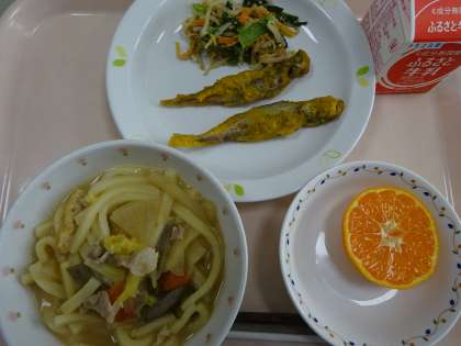 本日の献立 みそ煮込みうどん 牛乳 ししゃものカレー天ぷら 野菜のごまあえ
