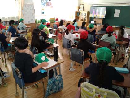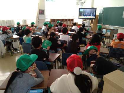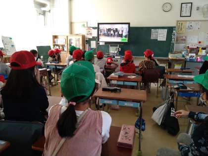 4年生は、どのクラスも帽子をかぶって視聴しました!本番の緊張感や楽しかった練習のことが思い出されてとても盛り上がりました。