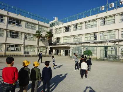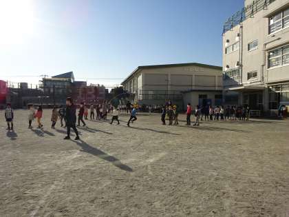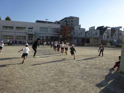今日の朝は、校庭では1,2年生が大なわとびの練習をしました。1年生も段々と上手に跳べるようになってきました。