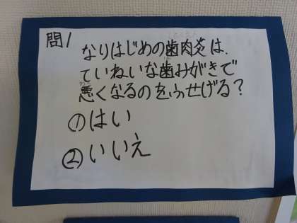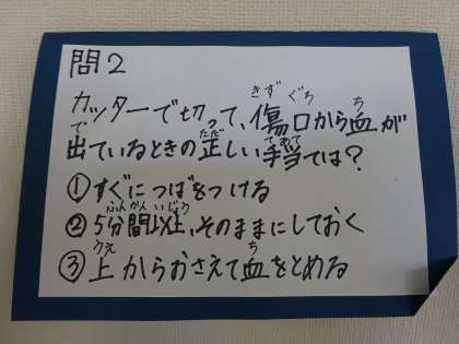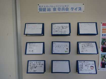 保健委員会が健康に関するクイズを作り、保健室廊下に掲示しました。カードをめくると答えと解説があります。