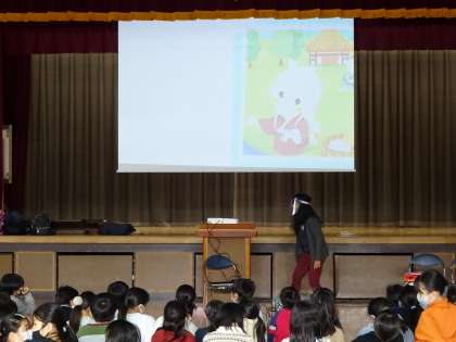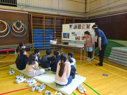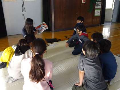 グループに分かれ、様々なゲームを通して英語によるコミュニケーションに親しみました。緊張もすぐにほぐれ、積極的にALTの先生にもかかわる子どもたちでした。