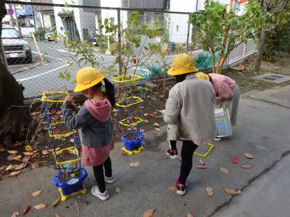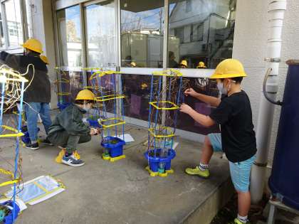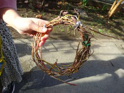 1年生が大切に育ててきたあさがお。その蔓を鉢から外して、リースにしました。上手に輪にできました。このリースに飾りを付けていきます。