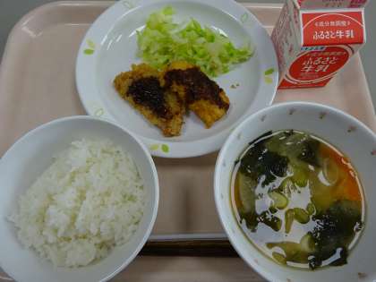 本日の献立 ごはん 牛乳 ハムカツ いかのフライ ゆでキャベツ