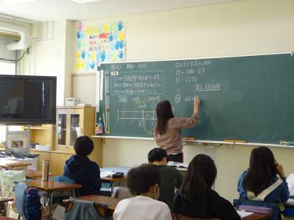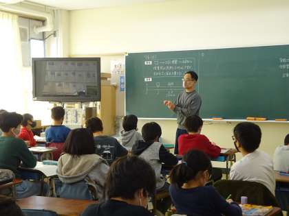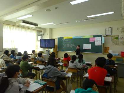 3年生以上の算数は、2クラスは3クラスに、3クラスは4クラスに分けて学習をしています。5年生は2クラスなので、算数は3クラスに分かれます。今、5年生は「割合」の学習中。全国の5年生が苦手とする学習です。丁寧に学習を進めています。