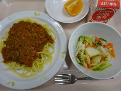 本日の献立 スパゲッティミートソース 牛乳 ポテト入りフレンチサラダ