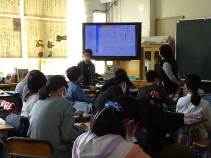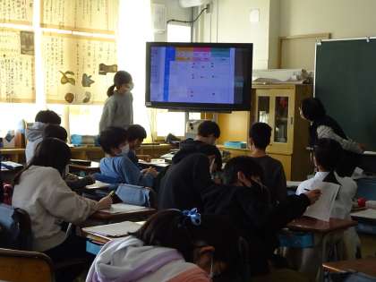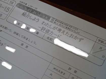 「紹介しよう 私が考えたおかず」の授業で、自分が考えたメニューを発表しました。聞き手は、発表内容の感想や評価をプリントに記入しながら発表を聞きました。