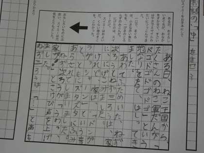 2年生は、国語で、まとまりに分けてお話を書いています。まずは、共通な絵を見て、お話の大まかな構成を考えました。そして、「はじめ」「中」「おわり」の順に、「だれが何をしたのかよく分かるように」よく考えて、「どのような様子かよく分かるように言葉を選んで」書き進めています。