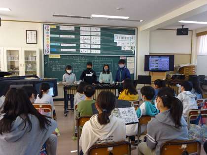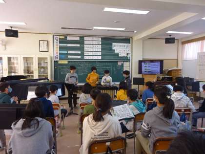 「役割を生かした黒鍵の音楽をつくろう」の学習を進めてきました。4人グループで話し合い、「合いの手」「伴奏」「ドローン」「メロディ」の役割を分担しました。木琴で音楽づくりです。話合い、試し、練習を重ね、いよいよ発表。1つとして同じ音楽はありません。各班工夫された音楽づくりができました。放送で全校に流す予定です。