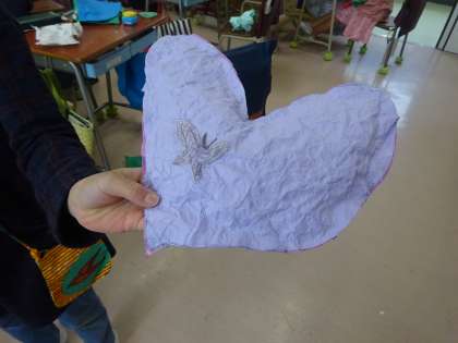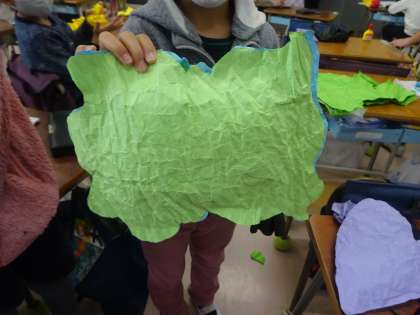 くしゃくしゃにして柔らかくなった画用紙を2枚合わせ、中にはいらない紙を詰めました。すてきなクッションのできあ上がりです。