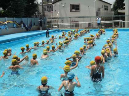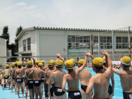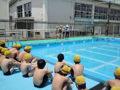 代表児童が自分のめあてをはっきり述べ、4年生は4年生としての自覚を持って、3年生はそんな4年生を真似てプール開きが行われました。安全な中で確実に個々の泳力が高められたら、と願っています。