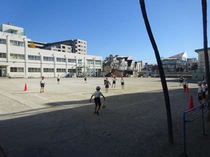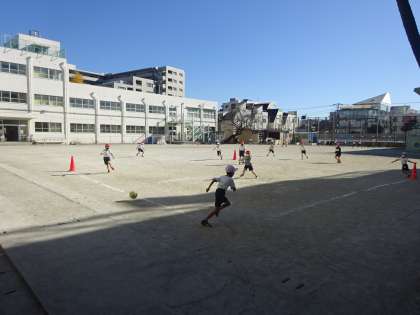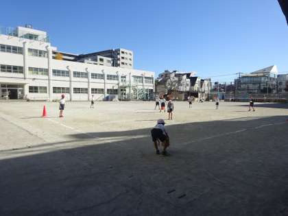 3年生は体育でキックベースを行っています。チームで作戦を立て、協力し、励まし合って取り組む様子が見られます。