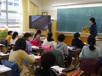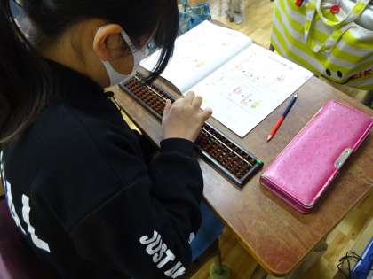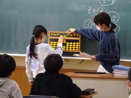 簡単な計算をそろばんを使ってしました。算数少人数担当と担任の二人で指導しています。今日は、そろばんが得意な音楽専科も指導に入りました。