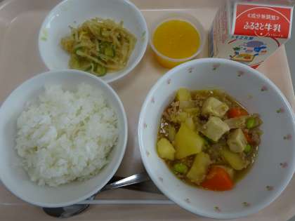 本日の献立 ごはん 牛乳 じゃがいものそぼろ煮 ごま酢かけ みかんゼリー