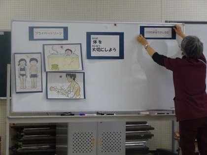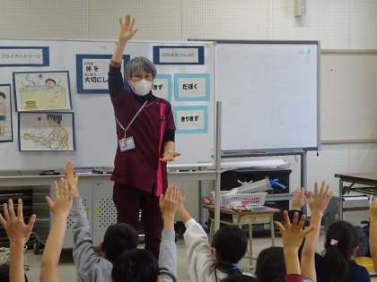 3年生の保健指導のテーマは、「体を大切にしよう」でした。「プライベートゾーン」と「けがの手当ての仕方」について学びました。「けがの手当て」については、「すりきず」「だぼく」「はなぢ」「きりきず」の場合の手当ての仕方を考えた後、主任養護教諭から正しい手当の方法を学びました。