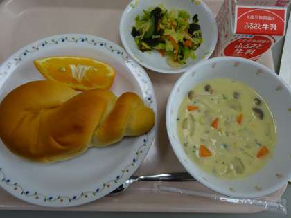 本日の献立 ミルクパン 牛乳 クラムチャウダー わかめサラダ いよかん