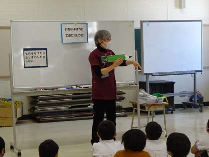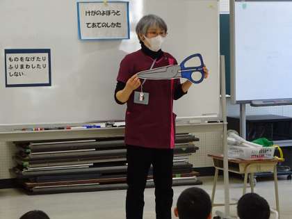 1年生は、「こういうことは危ないね。」「道具はどのように使えばいいかな。」気を付けたい怪我の話と手当てについて保健指導がありました。