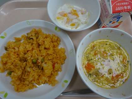 本日の献立 チキンライス 牛乳 卵スープ フルーツヨーグルト