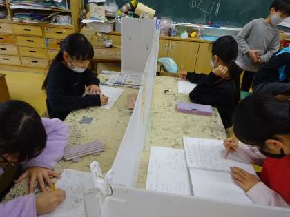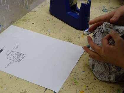 図工室に戻り、「他の人が見たときに、こんな気持ちにさせたいなあ」とイメージを広げてアイディアスケッチをしました。アイディアがほぼ浮かんできたところで、新聞紙で形をつくっていきました。どんな作品に仕上がるでしょう。みんなワクワクしながら学習を進めています。