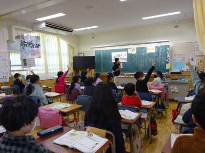 そして、「遠足の朝」という資料を基に、仲間外れをされている友達に対して、自分だったらどういうことができるか、正しいと判断したことを自信をもって行うことについて様々な意見を出し合いました。