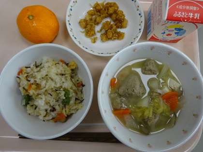 磯おこわ 牛乳 いわしのつみれ汁 大豆とじゃこの甘辛あげ みかん
