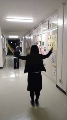 なわとびの中でも、「とばないのに・・・」かえし「とび」という名前がついている難しいとびかたです。1年生担任が「どうやって教えると分かりやすいか」と練習をしていました。そこに、学校長登場です。「どれどれ、とんでみようかな」とあざやかなかえしとびを披露してくれました。それを動画撮影する担任。とても参考になりました!