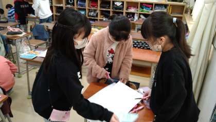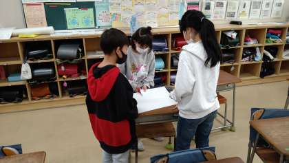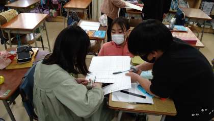 算数で「立体」の学習をしています。「直方体」「立方体」の面の形に注目して、実際に作ってみました。どんな大きさのどんな形の面が必要なのか、グループで話し合いながら決めました。完成した立体を見ながら、さらに詳しく特徴を確かめています。
