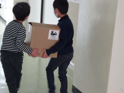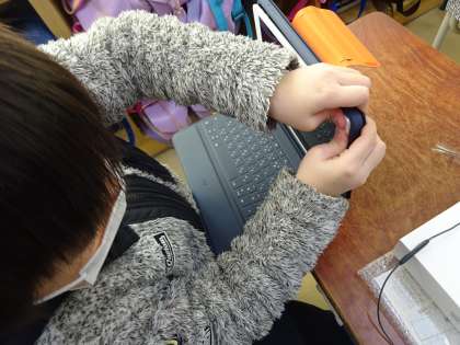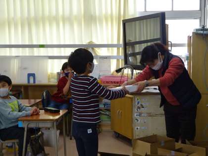2月1日に全校で「貸与式」を行った後、3,4,5年生の教室では、担任から一人一人にタブレットが渡されました。