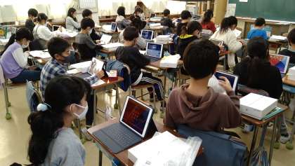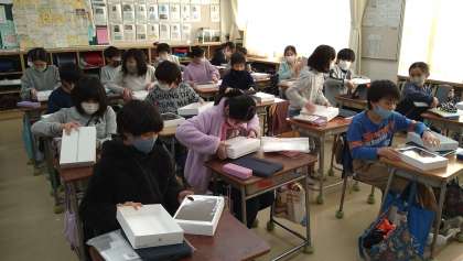 2月1日、朝会でiPad貸与式が行われました。それを受けて、4年生も各クラスで貸与式を行いました。一人一人手渡しをして、いよいよ箱を開けます。その瞬間をぜひ見ていただきたかったです。iPadが机に並んでいる様子は、昭和の時代に「未来にこんな風になるかも」と思っていた「未来の学校」のようでした。区から借りた大切なiPadです。卒業するまで、大切に大切にあつかうことを約束しました。おうちでも、この機会に、インターネットの使い方など、お話をしてみてください。