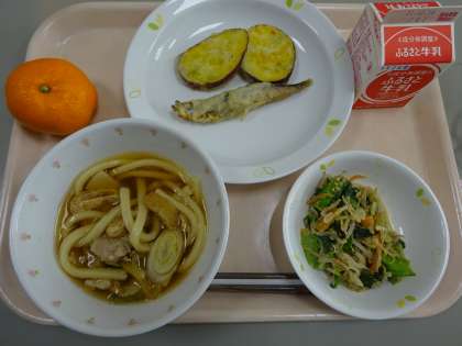 本日の献立 煮込みうどん 牛乳 天ぷら(さつまいも・ししゃも)野菜のごまあえ