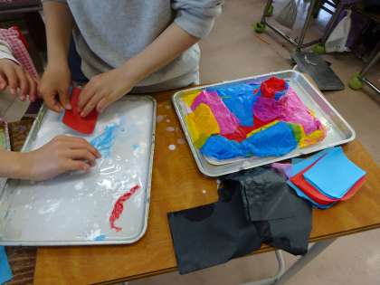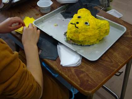 図工ではりこのかぶりものを作っています。今日は、発泡スチロールのカップやトレーで形をつくったものに、お花紙にのりをつけて何枚も重ねていきました。形や色、貼り方を工夫しています。