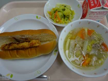 本日の献立 フィッシュサンド 牛乳 野菜のカレードレッシング ABCスープ