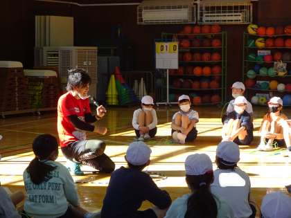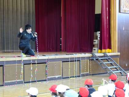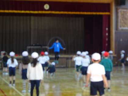 跳び方のコツも教えていただきました。駒繋の子どもは、他の学校よりも能力が高く、難しい技もできますね、と褒めていただきました。日常的に取り組んでいるからですね。 「ヒジキさんの演技を見て、すごく感動しました。憧れます。明日から縄跳びをもっと練習して上手になります!」という子どもたちの声がたくさん聞かれました。