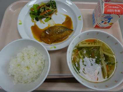 本日の献立 ごはん 牛乳 さばのみそ煮 おひたし 沢煮椀