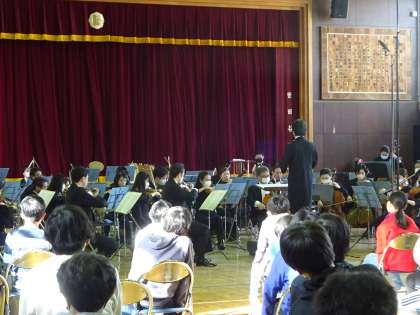 文化芸術による子供育成総合事業の巡回公演事業で「新日本フィルハーモニー交響楽団」によるオーケストラ鑑賞教室が本校体育館で行われました。CDでは味わえない貴重な体験をすることができた5年生、6年生です。指揮者の下、最大の集中力を発揮して演奏者みんなでつくりあげるもの、音楽の素晴らしさを体感したよい経験になりました。