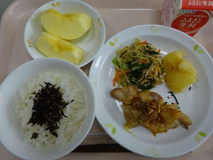 本日の献立 ごはん ひじきのふりかけ 牛乳 鶏肉の南蛮焼き 青菜ののりあえ