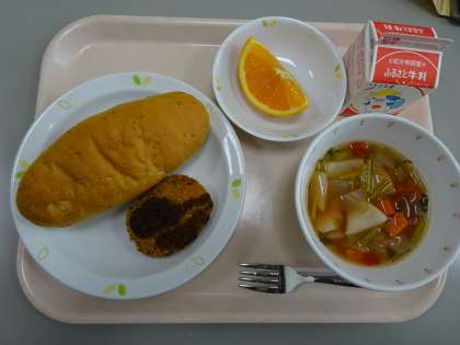 本日の献立 セサミパン コロッケ 牛乳 ミネストローネ 清見オレンジ