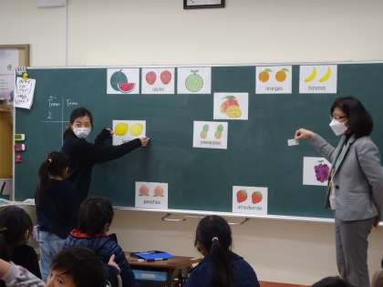 1年生も担任とALTとで外国語活動の学習をしています。果物の名前を覚えて、ゲームを通して外国語に親しみました。