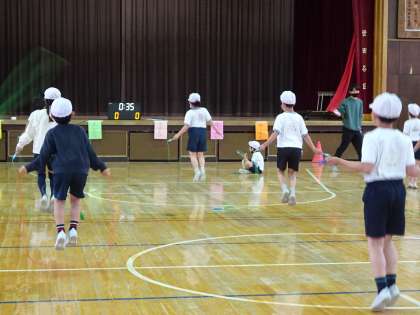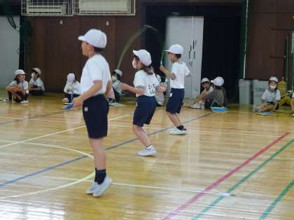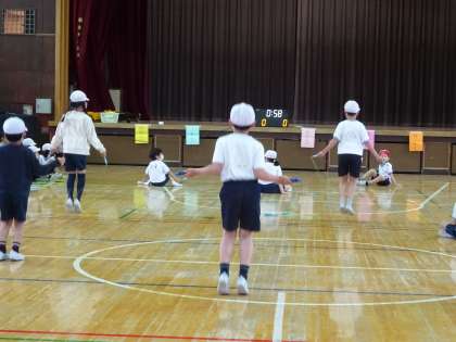 学年合同で1年間のまとめとして、なわとび大会をしました。時間とびも頑張りました。