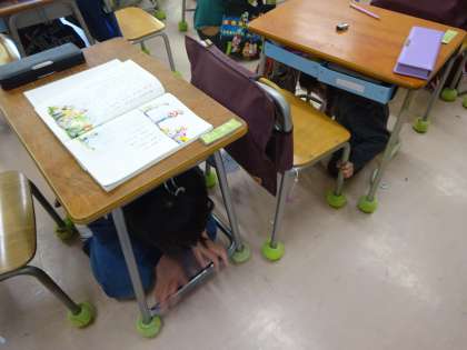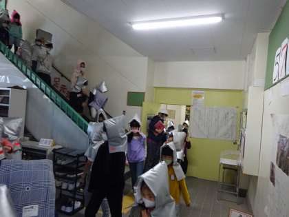 今年度最後の避難訓練を行いました。今日は、地震の後に理科室で火災が発生した想定で行いました。防火扉を閉めて訓練を行いました。