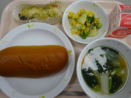 本日の献立 黒砂糖パン 牛乳 魚のガーリック焼き ブロッコリーとコーンのソテー