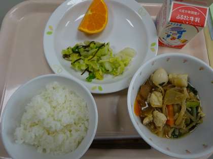 本日の献立 ごはん すきやき風 牛乳 キャベツの塩こんぶかけ せとか