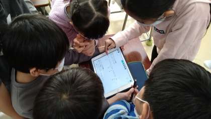 写真は4年生で、グループごとにロイロノートで謎解きが送られてきて、一生懸命考えているところです。他にも、1年間の思い出をスライドにしたり、お題にそった写真を撮るゲームをしたりと、どの学年も工夫をしながら活用しています。