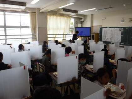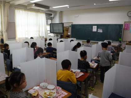 給食の時間を楽しみにしている子どもたちですが、以前としてコロナ禍にあり、パーティションを立てて静かに食べています。